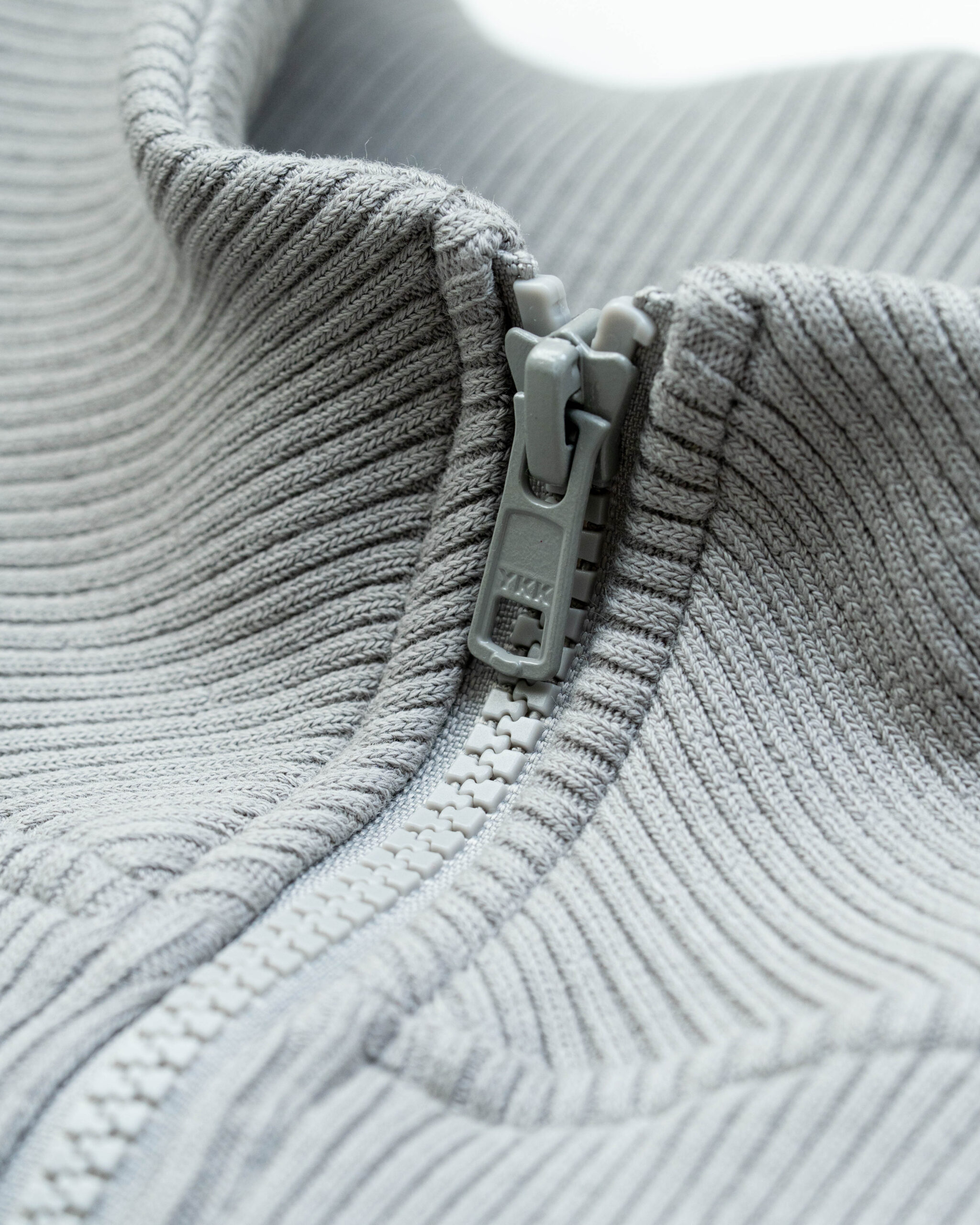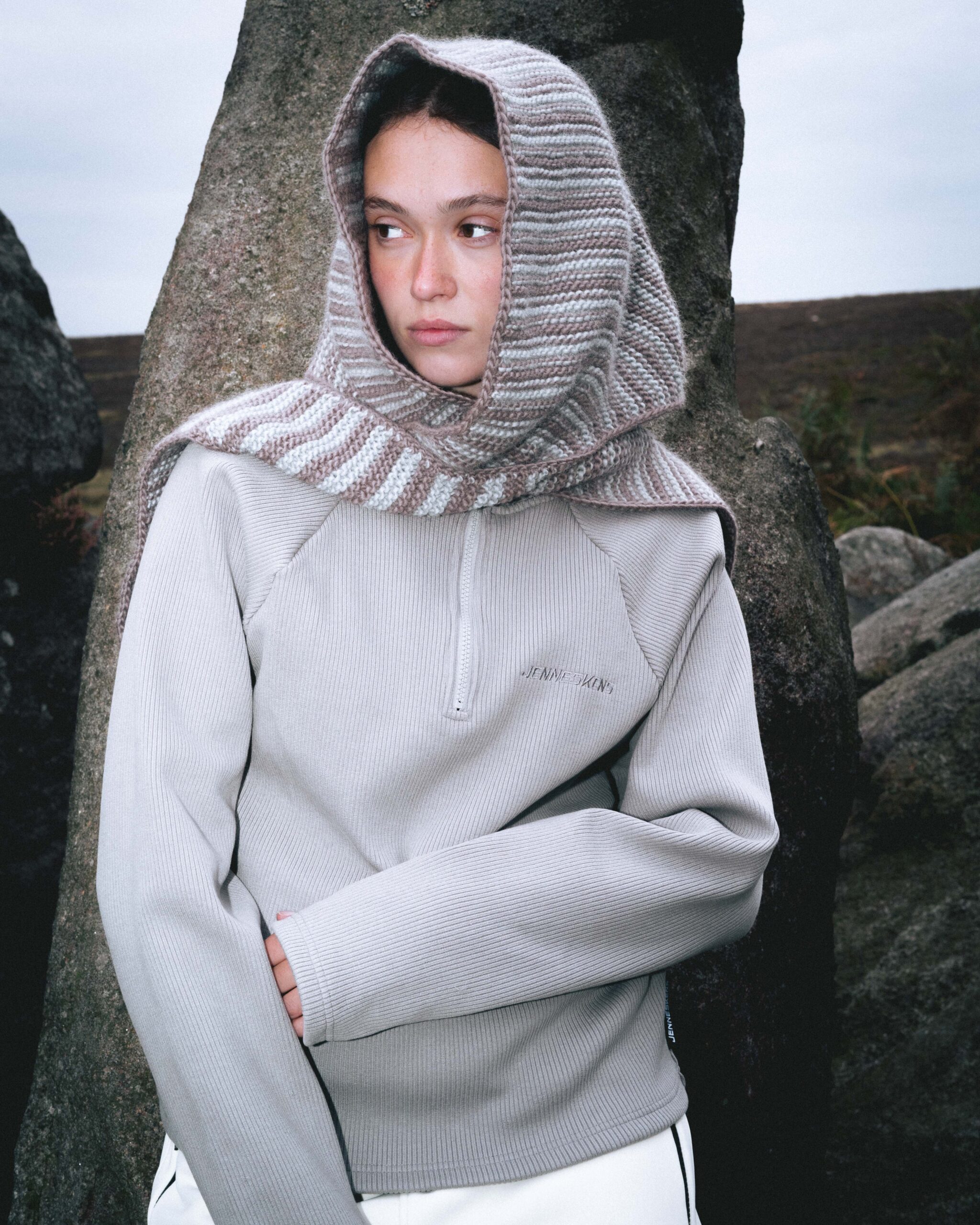 Unisex longsleeve in heavy 2×2 rib in newsprint brown. Recycled cotton blend with structure, stretch, and a premium hand feel.